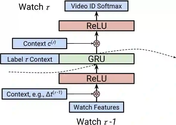 图中模型需要预测 τ 步用户会观看哪部视频,采用的是 softmax 分类的方式完成 candidate generation。循环神经网络单元使用的是 GRU,可以看到,用到的特征包括两种:
