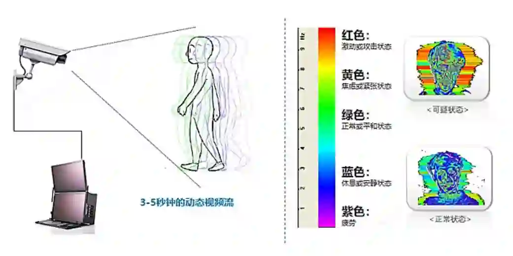 孟伟警官主要采取问话的方式,从战士们的面部微表情、肌肉收缩和语速等多方面进行综合判断,而“阿尔法鹰眼”则通过摄像头采集人体面部视频流,分析头部和颈部微小肌肉振动的频率和振幅等参数,甄别出有自体原发性焦虑紧张状态的人员。
