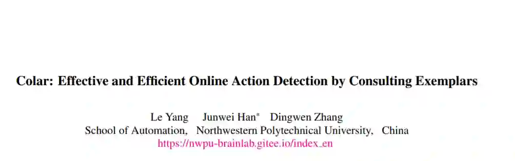 杨乐,韩军伟,张鼎文. Colar: Effective and Efficient Online Action Detection by Consulting Exemplars, CVPR 2022.