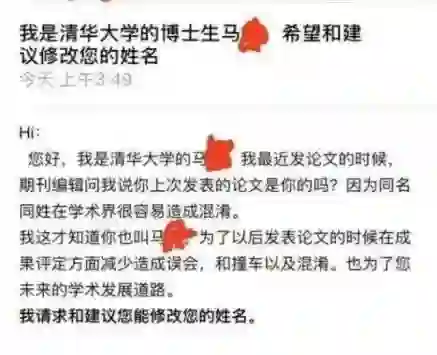起因是清华大学的马姓博士生在发论文的时候,发现学术界出现了和自己同名同姓的人,这就引发了这位马姓同学的不满,因为担心未来在学术界发表论文的时候在成果评定方面造成误会和混淆(比如外人搞混自己和对方发的论文等),于是发了一封邮件让别人改名字,信中说“我请求和建议您能修改您的姓名”。