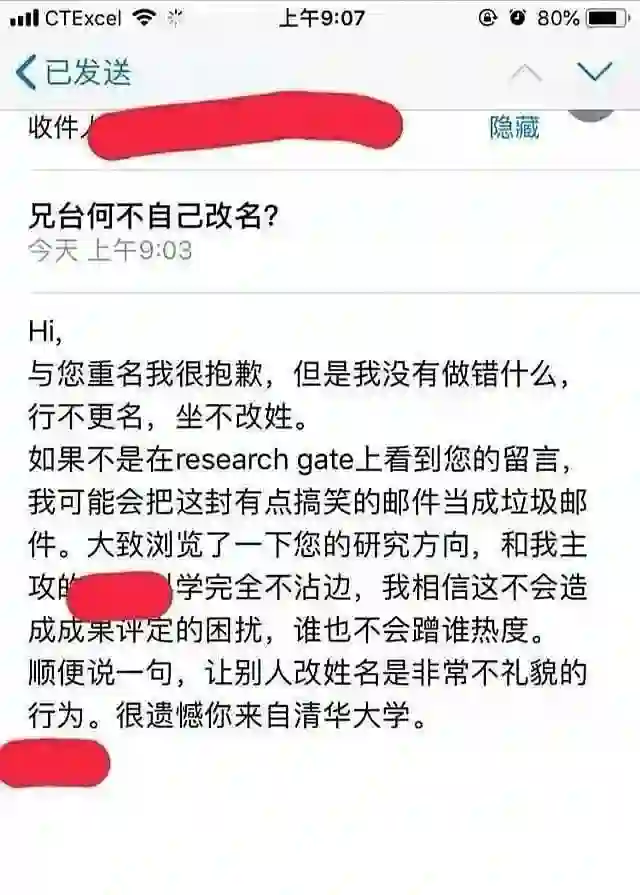 而这位同名者收到邮件更是觉得莫名其妙,凭什么自己就要改名字?他也回复了一封邮件,怼了回去。