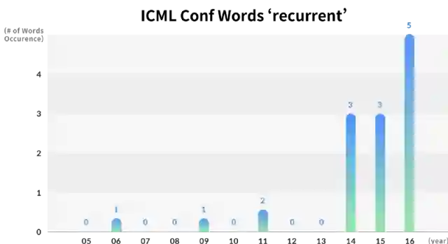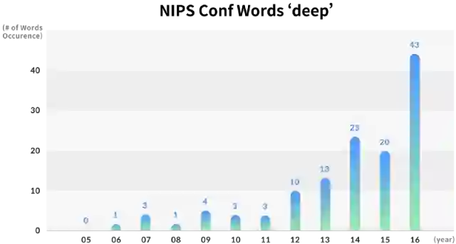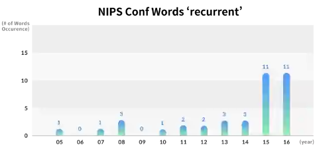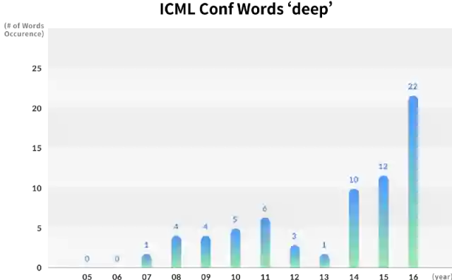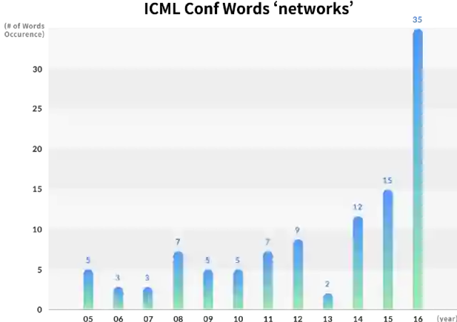 虽然关键字“深度”在ICML中没有出现,但在2006年的NIPS中只出现一次,但在2016年随着“网络”一词成为最显著的关键字,在ICML中出现了22次,在NIPS中出现了43次。