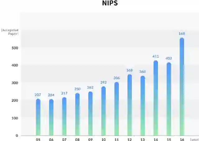 而至于NIPS,接受的论文数量从2005年的207份增加到2016年的568份,增加了一倍多。