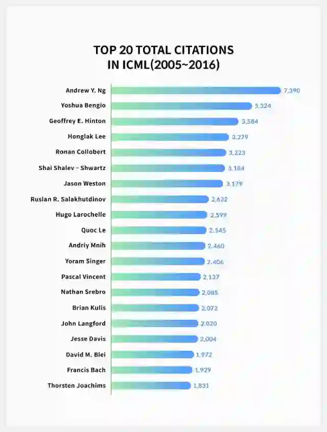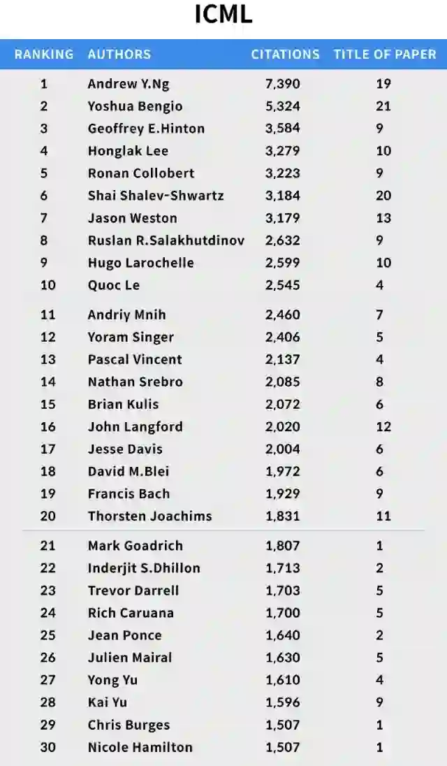 在过去的12年里,ICML中被引用次数最高的前20名作者