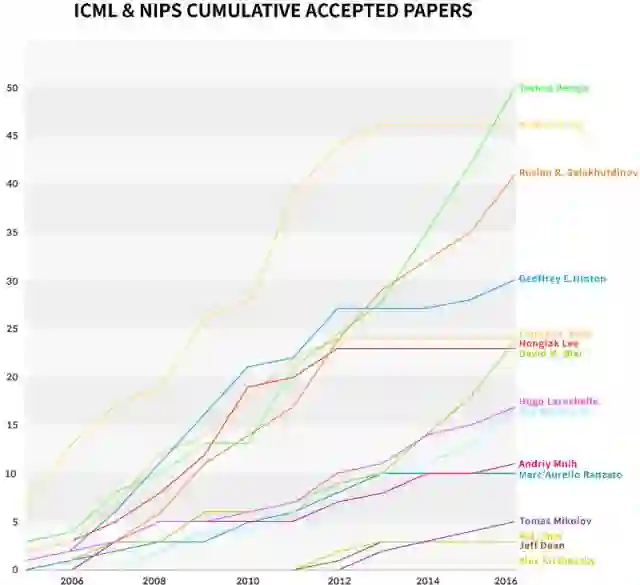 为了研究AI研究领域的最新趋势,研究小组对2005年至2016年期间ICML和NIPS发表的6163篇科学论文进行了分析,从各种角度,如累积引用,作者的合作网络,以及论文中关键字的变化,分析了最近的趋势和变化。