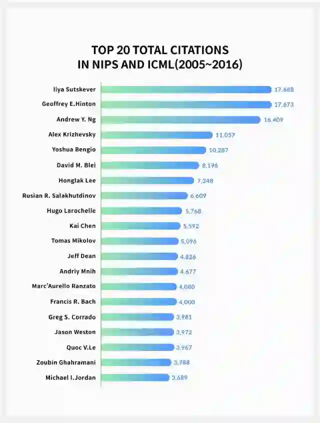 在过去的12年里,ICML和NIPS中累计被引用次数最高的前20名作者
