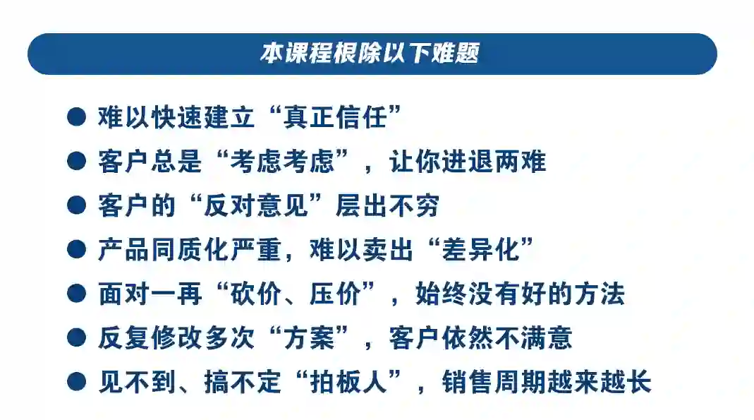 1、只能邀约,却总是无法达成交易,怎么办? 2、见到客户无法及时展开有效对话,怎么办? 3、判断不出客户的购买意愿,怎么办? 4、对话半天,挖掘不到用户真实需求,怎么办? 5、当顾客产生质疑却不知如何作答,怎么办?