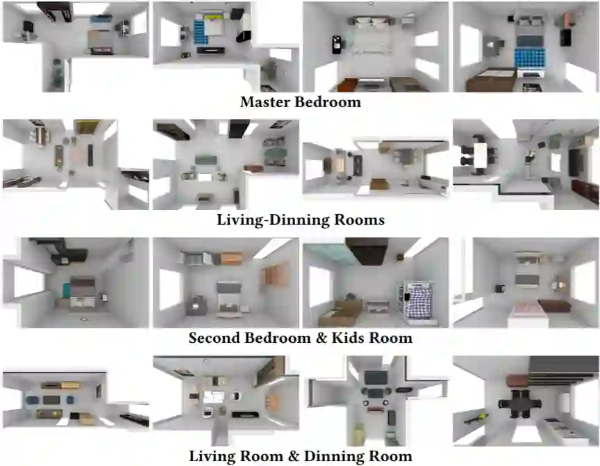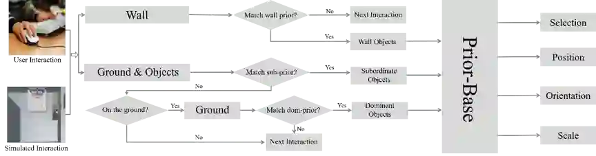 文章的核心之一在于一个实时的框架。上图展示了方法的执行流程,该流程表示每一个鼠标挪动的‘瞬间’。交互的流程分为三个‘分支’,每个‘分支’对应一‘类’物体,每类物体的【先验学习】与【推断】方法均不同。三个类别分别是:主物体、从物体与墙体物体。若鼠标指向墙体,框架则首先匹配墙体物体的先验;若鼠标在其他几何上,框架则尝试匹配从物体的先验。若没有从物体的先验被匹配,则匹配主物体的先验。框架基于从数据集中学习的用于放置不同类型对象的先验知识,这些先验会根据每个特定场景的特定时刻进行定制,从而大大减少计算量。我们每次匹配到一个先验,这个先验都会回答系统:要把那个物体放在哪里,包括物体的选择、平移、旋转、缩放。同时,注意到‘Prior-Base’,这个先验库会基于用户的交互不断更新,比如加入了双人床,会进一步引入床头柜的先验。因此,先验库的维护永远仅仅包含和场景相关的最小先验集合,这也是本文实现实时的原因之一。