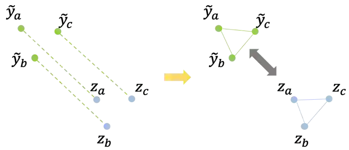 图5 结构相似性示意图。左:变换\hat{y}—>z;右:变换后样本间关系保持相似。