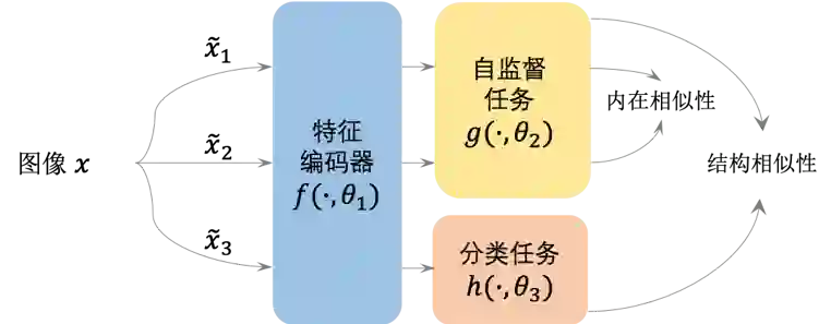 图3 Co-learning通用算法框架,由自监督和分类两个任务协同完成,在保持各环节数据自身内在特征相似性的同时,保持两个任务变换后特征的整体分布结构相似性。