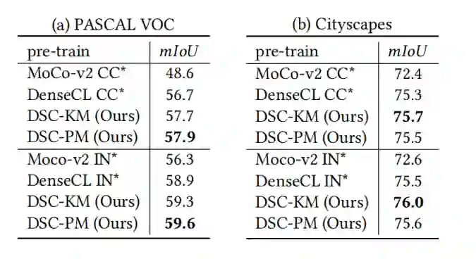 DSC分别在ImageNet和MS COCO上进行了预训练,在不同数据集上的目标检测和分割任务上进行了评估(表1、表2、表3)。CC and IN分别表示在MS COCO和ImageNet上预训练的模型,*表示复现结果。可以看出,所提方法在各种下游密集预测任务上的性能,均超过了SOTA(DenseCL)和baseline(MoCo-v2),显示出DSC的有效性。如图4所示,我们在PASCAL VOC语义分割任务上,可视化了在MS COCO微调任务上不同模型的可迁移性。DSC模型使得分割任务的性能变得更好,再次证明了我们的语义挖掘方法对于下游密集预测任务的有效性。