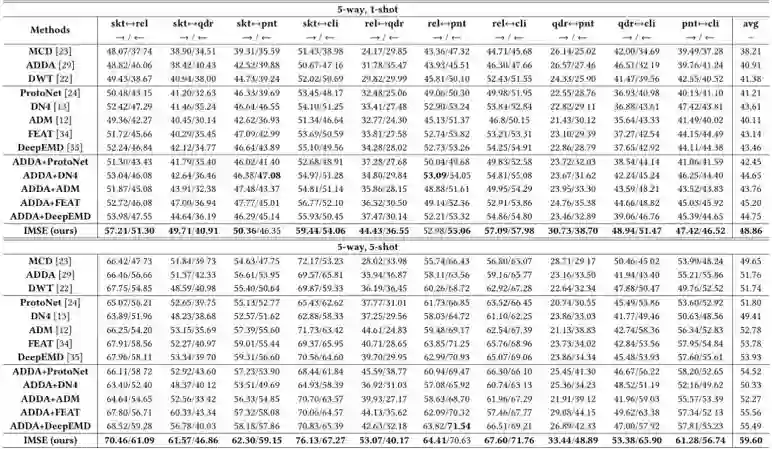 表1展示了一系列方法在DomainNet数据集上的1、5-shot小样本无监督域适应任务性能,而IMSE方法取得了最好的成绩。表2展示了消融实验,实验证明了同时使用特征和相似度模式层面的跨域对齐的有效性,通过相似度层面的跨域对齐,模型的性能被很大的提升。如表3所示,本文在miniImageNet数据集上进行小样本学习(FSL)的对比实验,IMSE方法也表现出了不错的分类性能。总的来说,IMSE方法能够有效地解决小样本无监督域适应问题以及小样本图像分类问题。