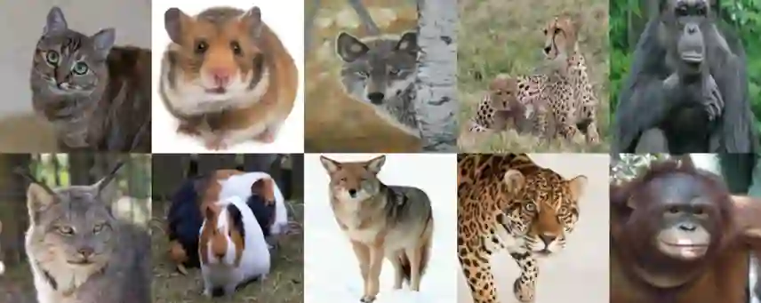 人工标注可能产生一些错误的标签。如下图1所示,是Animal-10N数据集的图例。这个数据集包含了十种动物的图像,可以分为五组容易混淆的动物:猫和猞猁、仓鼠和豚鼠、狼和豺、猎豹和美洲虎、黑猩猩和红猩猩。人工标注时容易给这些动物打上错误的标签,从而导致模型在错误的知识上学习。