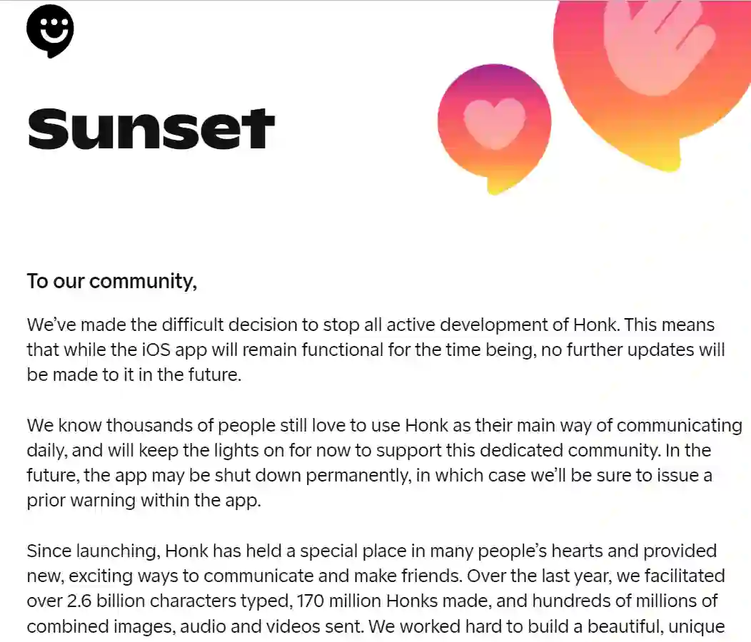 在「Honk」的官方网站上发布了一篇叫做 Sunset 的文章,这篇文章中提到,「Honk」将停止对产品的所有开发,即使目前「Honk」iOS 端的 App 依然可以正常下载使用,但是在未来再也不会有任何更新。