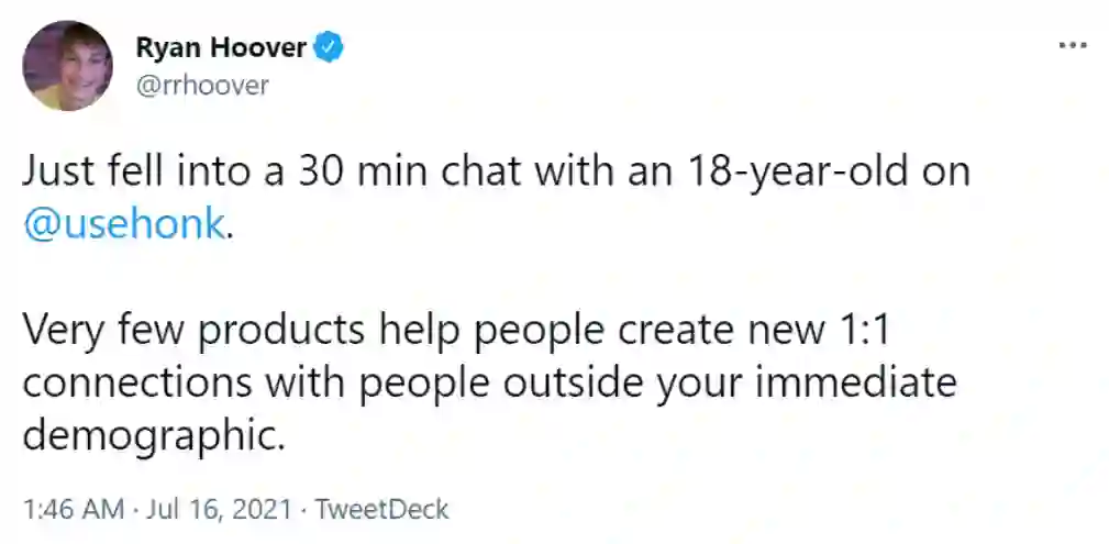 Product Hunt创始人Ryan发曾发文称在「Honk」上与一名18岁用户聊了30分钟