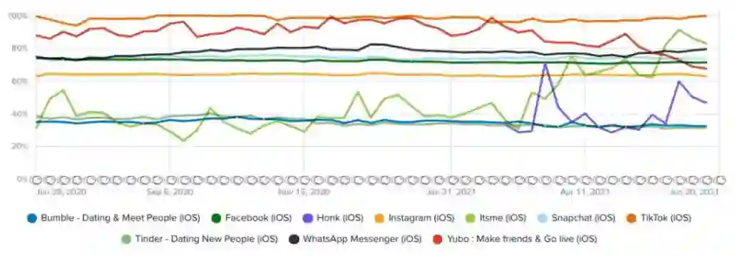2020 年年中-2021 年年中头部社交 App 的周打开率 | 来源:App Annie