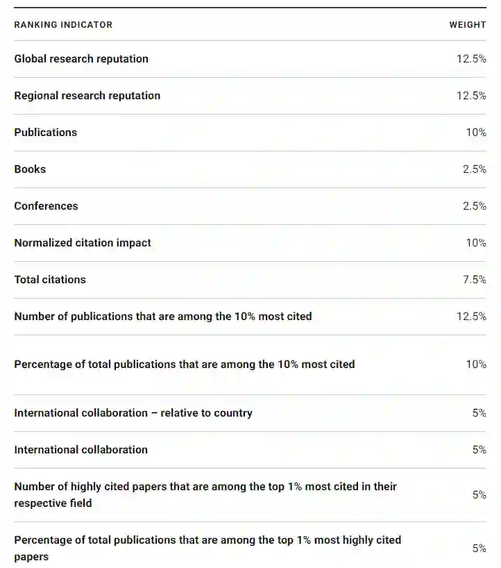 包括:全球研究声誉(12.5%)、地区性研究声誉(12.5%)还有发表论文(10%)、出版书籍(2.5%)、学术会议(2.5%)、标准化引用影响(10%)、总引用次数(7.5%)、国际合作(国家)(5%)、国际合作(5%)。