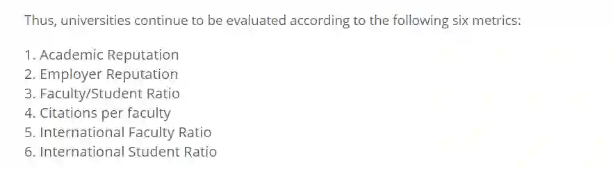 而 QS 世界大学排名依据一共 6 项,排名过于看重学术声誉(40%)和雇主声誉(10%),这两项加起来就有 50% 了,因此主观因素会相对较多。