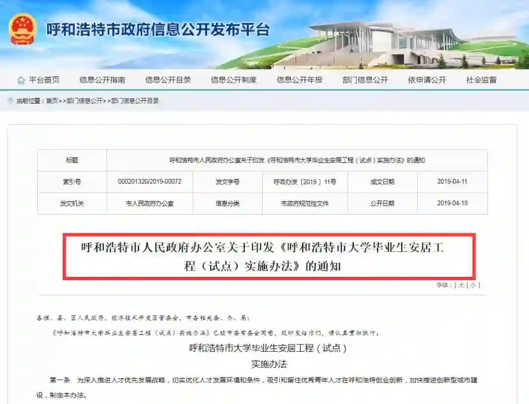 4月18日,内蒙古呼和浩特市人民政府办公室关于印发《呼和浩特市大学毕业生安居工程(试点)实施办法》的通知公开。其中提及,具有普通全日制本科及以上学历的应往届毕业生(往届3年及以内),可半价买房。