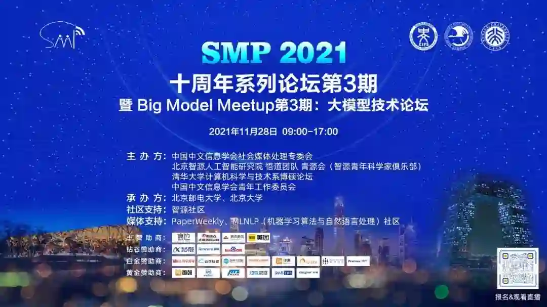2018年以来预训练模型技术成功将深度学习框架应用于海量无标注数据,在大数据和大算力的支持下,「大模型」一定程度上具备了通用的语言能力,可以非常方便地通过微调技术适配到广泛下游任务,任务性能得到普遍显著提升,成为自然语言处理等领域的最新学习范式,前沿动态日新月异。 「全国社会媒体处理大会(SMP)」创立于2012年,是中国中文信息学会社会媒体处理专委会的旗舰会议,本次论坛为SMP十周年系列纪念活动的第3场。「Big Model Meetup」系列活动则是由智源研究院悟道团队、青源会、清华大学计算机科学与技术系博硕论坛、中国中文信息学会青年工作委员会共同组织的大模型技术社区。本次论坛由智源社区提供社区支持,PaperWeekly、MLNLP(机器学习算法与自然语言处理)社区提供媒体支持。 本次论坛以大模型加速计算技术为主题,于2021年11月28日在线上召开,邀请了周明、车万翔、邱锡鹏等著名学者担任特邀讲者,并邀请多位优秀青年学者做前沿技术报告。