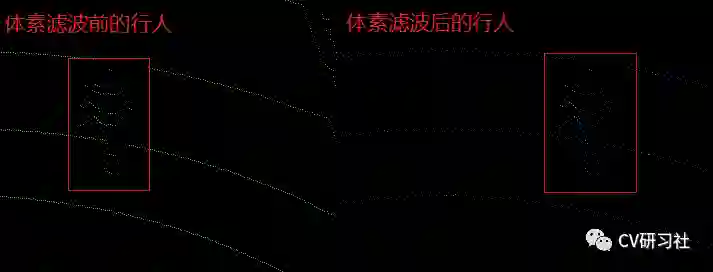 如下图所示:经过体素网格下采样后的行人,点云会变得更稀疏。主要是针对线束比较高的激光雷达或者多个雷达数据叠加时,平滑点云间隔的情况使用。
