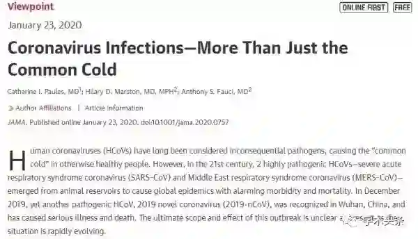 另外, JAMA发表题为“CoronavirusInfections—More Than Just the Common Cold”的观点文章,系统总结了最新的武汉肺炎的进展。