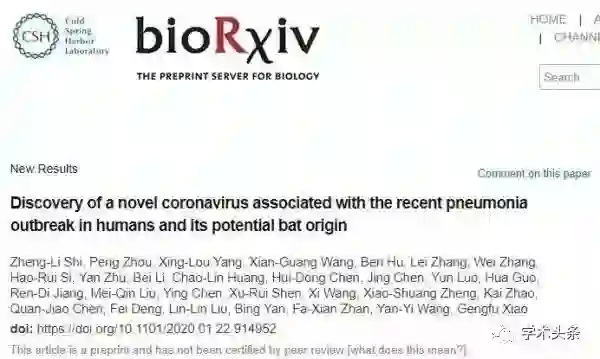 中科院武汉病毒所石正丽团队在bioRxiv在线发表题为“Discovery of a novel coronavirus associated with the recentpneumonia outbreak in humans and its potential bat origin”的研究论文,该研究对先前的结果提出了新的挑战,认为蝙蝠才是最有可能的携带2019-nCoV病毒的野生动物。