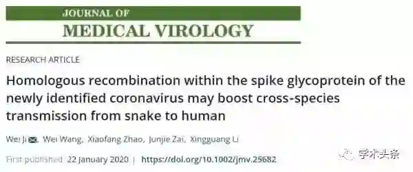 Journal of MedicalVirology 杂志上发表了北京大学、广西中医药大学、宁波大学、武汉生物工程学院等单位联合完成的论文:Homologous recombination within the spike glycoprotein of the newlyidentified coronavirus may boost cross‐speciestransmission from snake to human,该研究表明,蛇是造成当前武汉新型冠状病毒2019-nCoV感染爆发的最可能的野生动物库。
