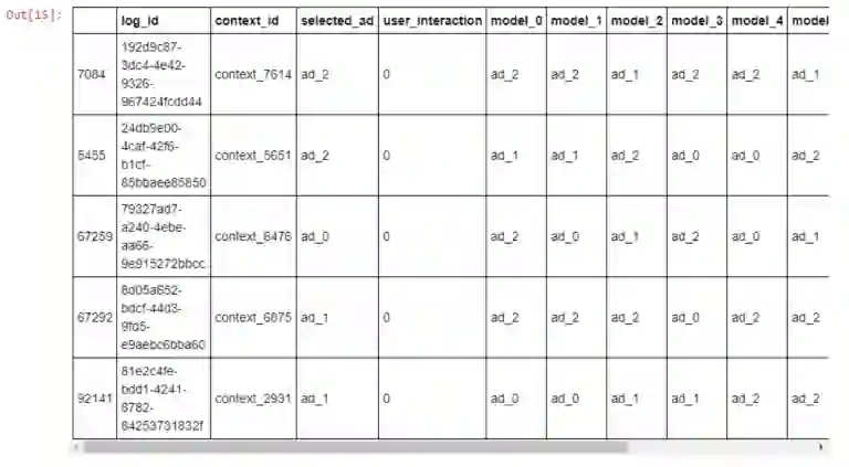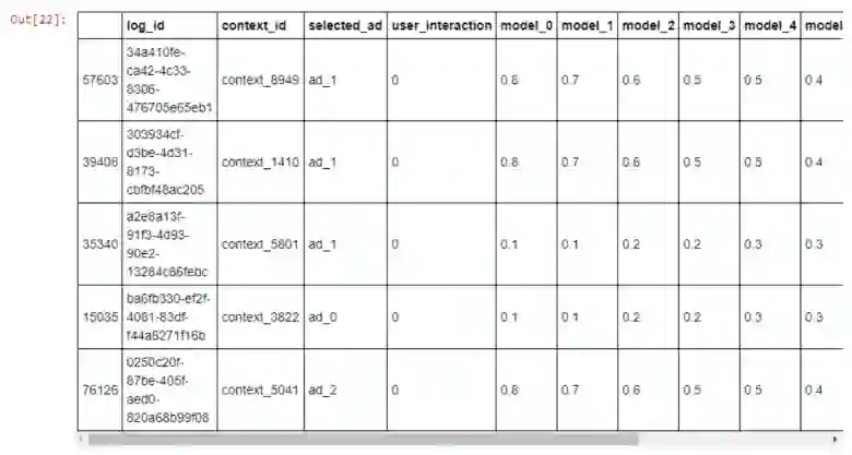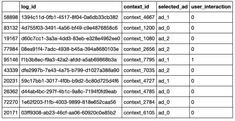 num_iterations = 100000# create empty df for storing logsdf_random_serving = pd.DataFrame(columns = ["log_id", "context_id", "selected_ad", "user_interaction"])# create unique ID for each log entrydf_random_serving["log_id"] = [uuid4() for _ in range(num_iterations)]# assign a context id to each log entrydf_random_serving["context_id"] = np.random.choice(user_contexts, size=num_iterations, replace=True, p=user_context_selection_prior)# randomly sample an ad to show in that contextdf_random_serving["selected_ad"] = np.random.choice(ads, size=num_iterations, replace=True)# for each log entry, sample an action or click or not using the click probability assigned to the context-ad pair in step 1def sample_action_for_ad(context_id, ad_id):prior = user_context_priors.get(context_id)[np.where(ads == ad_id)[0][0]]return np.random.binomial(1, prior)df_random_serving["user_interaction"] = df_random_serving.apply(lambda x: sample_action_for_ad(x["context_id"], x["selected_ad"]), axis=1)# a snapshot of the datadf_random_serving.sample(10)
