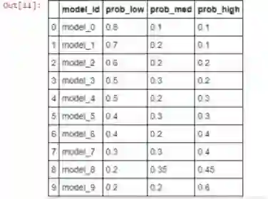 new_model_names = np.asarray(["model_{}".format(i) for i in range(new_model_priors.shape[0])])pd.DataFrame(data=np.hstack([np.atleast_2d(new_model_names).T, new_model_priors]),columns=["model_id", "prob_low", "prob_med", "prob_high"])