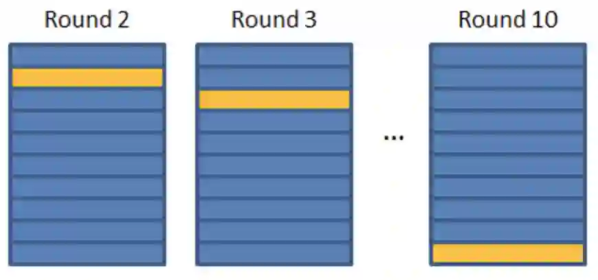 首先可以将训练数据分为10份,将其中的9份作为训练集(如下蓝色部分),其中的一份作为测试集(如下黄色部分)