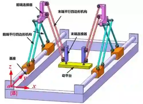 中国科学院宁波材料技术与工程研究所先进制造技术研究所精密运动与先进机器人团队最新设计的四自由度并联机器人,可以实现 3T1R 四个自由度的运动,是少自由度并联机器人的创新设计之一,其主要特点为2条相同支链通过被动转动副连接到动平台上,且每条支链有2个相同分支通过安装在基座上的移动副作为驱动。为进一步分析机构特点,采用螺旋理论验证了该机构自由度的数目及机构的运动学特性,得到了其位置的封闭解,根据机构的运动学特性和构型特点,该机构位置正解的封闭解最多有8组解,位置反解最多有4组解,结果表明,运动学分析简单是此并联机器人的特点之一。此外,具有构型对称、工作空间大、速度快且定位精度高的特点。相比于传统的并联机器人而言,它能够实现 XYZ 三个方向的运动与一个绕Z轴方向的转动,且在驱动方向工作空间可依作业需求扩展,增大了工作空间的范围。