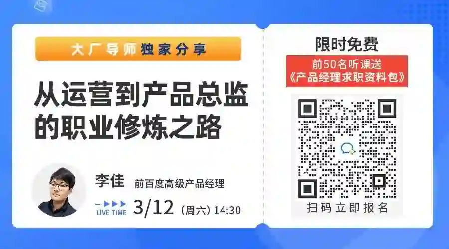 ⭕3月12日(周六)14:30-15:30,原百度高级产品经理、原老饭骨产品总监@李佳,1小时为你独家分享:从运营到产品总监的职业修炼之路,带大家剖析产品经理工作必经的5个阶段!