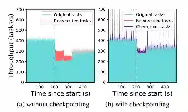 t=200s 时,我们停止 10 个节点中的 2 个,导致集群中 2000 个 actor 中的 400 个需要在剩余节点上恢复。(a)显示的是没有中间节点状态被存储的极端情况。调用丢失的 actor 的方法必须重新串行执行(t = 210-330s)。丢失的角色将自动分布在可用节点上,吞吐量在重建后完全恢复。(b)显示的是同样工作负载下,每 10 次方法调用每个 actor 自动进行了一次 checkpoint 存储。节点失效后,大部分重建是通过执行 checkpoint 任务重建 actor 的状态(t = 210-270s)。