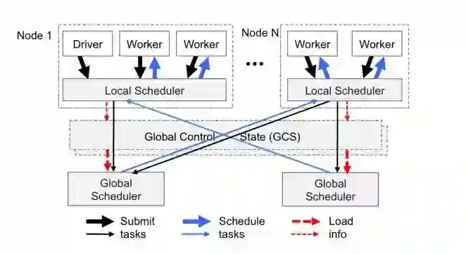 自底向上的分布式调度器。任务由 driver 和 worker 自底向上地提交给局部调度器(local scheduler)。局部调度器可以选择局部调度任务,或将任务传递给全局调度器。通过允许本地决策,降低了任务延迟,并且通过减少全局调度器的负担,增加了系统的吞吐量。