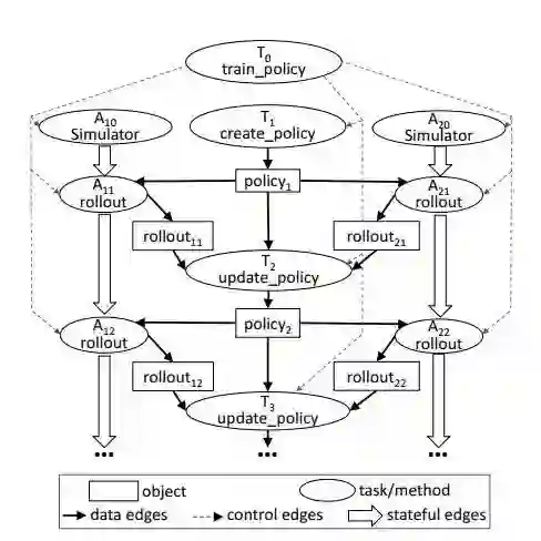 RL 应用的计算图是异质的、动态变化的。一次仿真可能会花掉几毫秒到几分钟的时间,仿真的结果又决定未来仿真的参数。
