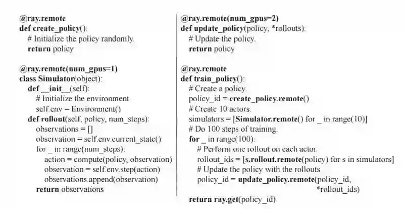 为了支持 RL 应用所带来的异质和动态工作负荷要求,Ray 采用与 CIEL 类似的动态任务图计算模型。除了 CIEL 的任务并行简化外,Ray 在执行模型顶层提供了代码简化,能够支持诸如第三方仿真的状态结构。