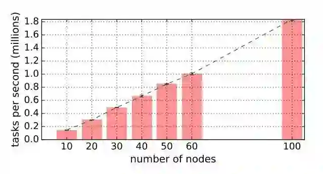 全局调度器的主要职责是在整个系统中保持负载平衡。Driver 在第一个节点提交了 100K 任务,由全局调度器平衡分配给 21 个可用节点。