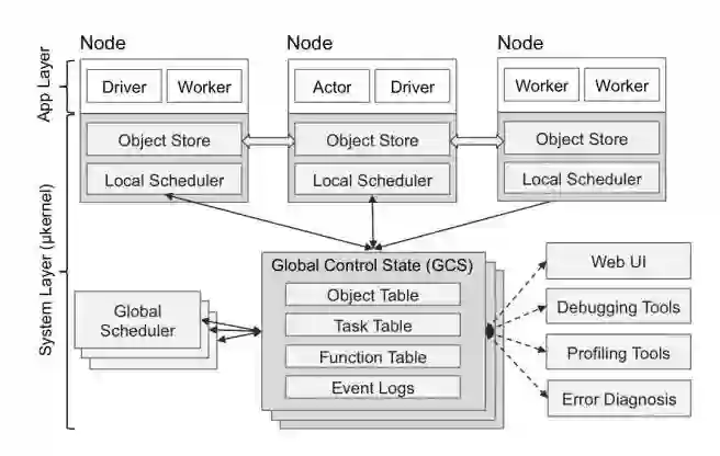 全局状态存储 GSC(Global Control Store)。系统所有的控制状态存储在 GSC 中,这样系统其他组件可以是无状态的。不仅简化了对容错的支持(出现错误时,组件可以从 GSC 中读取最近状态并重新启动),也使得其他组件可以横向扩展(该组件的复制或碎片可以通过 GSC 状态共享)。