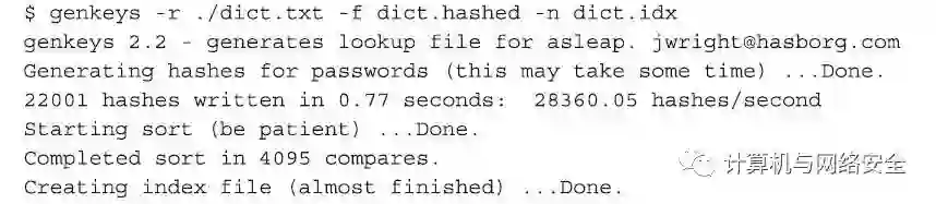 “轻量级扩展认证协议”的漏洞是由Joshua Wright首次发现并展示出来。他以Asleap来命名用来展示这一漏洞的软件工具。Asleap的运行,需要先捕获一些EAP进行协议握手时的一些数据包。要完成这种捕获操作,您既可以直接使用Asleap工具本身得到,也可以通过任何其他的“嗅探器”(sniffer)得到。无论采取哪种方式,我们要做的第一件事情,就是创建一个散列字典文件(hashed dictionary file)。这个文件可以用来从任何“轻量级扩展认证协议”保护的网络中还原密码。下面创建一个散列字典文件: