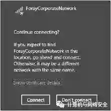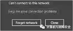 一旦Windows客户端执行完WPA认证时的版本比较后,下一步就是验证在“传输层安全”隧道另一端的”认证证书”是否有效。在Windows默认设置下,如果“认证证书”验证失败,那么该Windows用户客户端将不被允许连接到该无线网络上。由于该客户端以前是成功地连接到过这个网络的,所以这系统会提示是否要“删除网络连接”(forget the network),如图5所示。