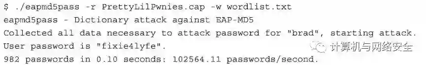 使用eapmd5pass软件破解“基于消息摘要第5版的扩展认证协议”的操作非常简单:我们指定一个捕获数据包的文件,该文件中包含MD5的“质疑”字段和“回应”字段的数据包(通过参数“-r PrettyLilPwnies.cap”来实现),再指定一个字典文件(通过参数“-w wordlist.txt”实现),然后按回车键。如果字典中包含了目标账户的密码,那么不久eapmd5pass软件将会成功地还原出这个密码。之后,使用这组账号和密码,就可以作为一个有效的用户连接到这个无线网络,并“合法”地登录。