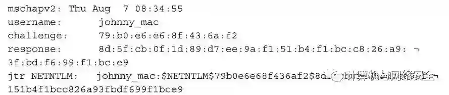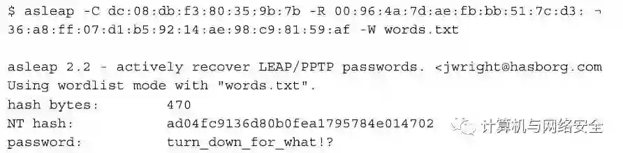 如果我们通过asleap软件运行这些结果,我们就会得出如前面Windows实例中的结论,即结果同样是“johnny_c/turn_down_for_what!?”。