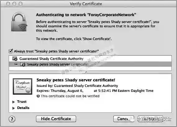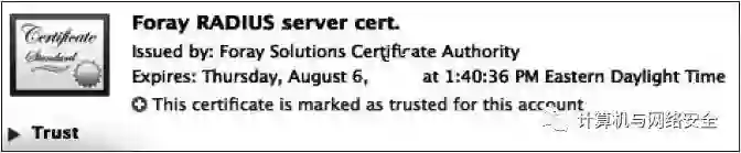 到目前为止,我们已经看到了Windows客户端在面对“骗子”RADIUS认证服务器的时候是如何表现的。下面我们通过比较的方式看看Mac的OS X客户端在遇到同样情况时的表现。
