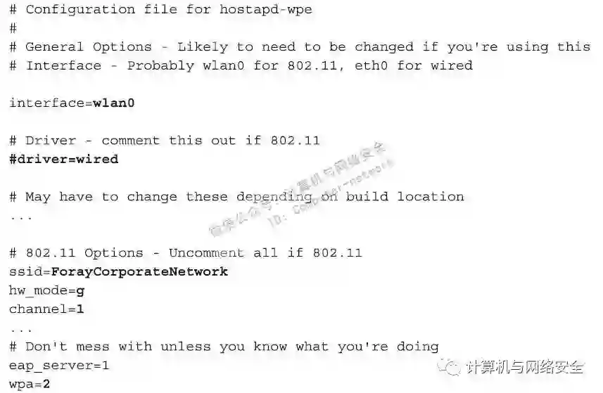 在开始使用hostapd-wpe软件之前,我们需要修改该程序的配置文件hostapd-wpe.conf。因为我们是在无线接口上运行的,所以我们将接口设置为wlan0,并且禁用(disable)掉“驱动程序默认是有线”的那一行。在这个文件中,由当前位置稍微向后移动,我们还会看到有很多与802.11相关的选项,我们还可以将所有的这些802.11的选项都设置为“允许”(enable)。最后,我们找“WPA的版本”这一项,将其值改为“2”以上。更改完成之后的hostapd-wpe.conf文件,看起来应该像下面这样(粗体部分表示修改后的内容)。