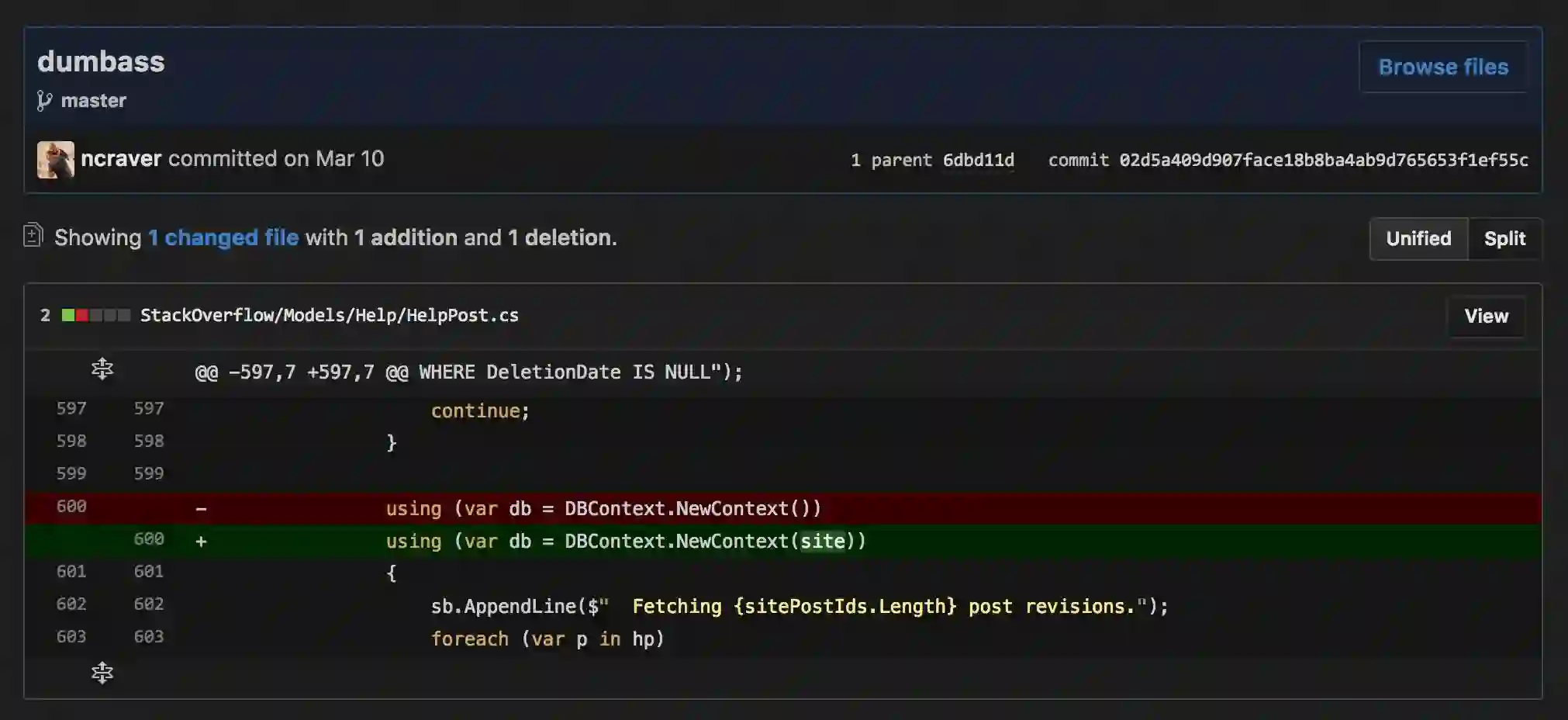 原始帖子被修复后,我们只需要将重新生成的HTML重新填充到“站点”表中。这就是我排除了一个关键的代码的地方。回填查看当前网站(回收站被调用的站点),而不是原始站点。作为一个例子,这导致了一个HelpPost从postbox5在meta.stackechange.com上被替换为在stackoverflow.com上发布的12345。有时这是一个答案,有时候是一个问题,有时候是维基标签。这导致了在整个网络中有一些非常有趣的帮助文章。这里有一些创造的宝石。
