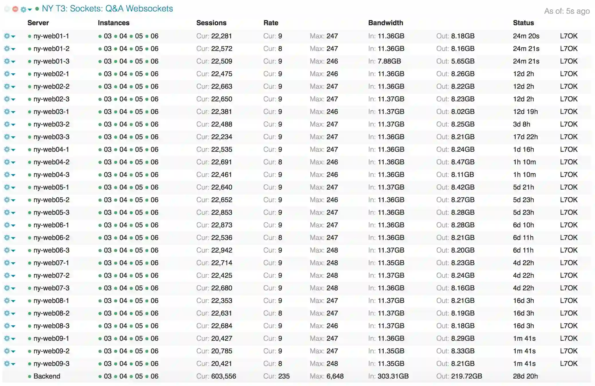 这个可以快速概括。 Websockets并不困难,这是我们在某些方面做的最简单的事情。我们使用websockets来实时更新用户,例如信誉改变,收件箱通知,新问题被询问,添加新的答案等。这意味着基本上每个打开Stack Overflow的页面都有一个相应的websocket连接到我们的负载均衡器。