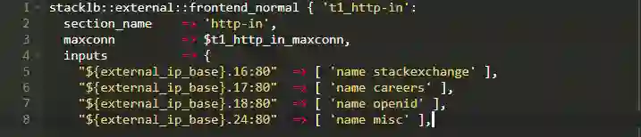 记得我们前面提到的dnscontrol吗? 这将使所有这一切都保持同步。 由于JavaScript配置/定义,我们可以轻松地共享所有并简化代码。 我们匹配所有IP的最后一个八位字节(在所有数据中心的所有子网中),所以在一些变量中,AD和外部的所有DNS条目都对齐。 这也意味着我们的HAProxy配置也更简单,它归结为: