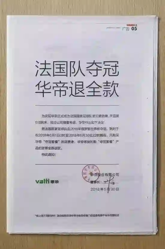 华帝:如果法国队夺冠 退款额将低于7900万元
