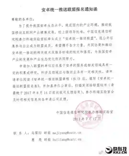 泰尔实验室今天又放出英雄帖,邀请安卓生态业内公司,参与安卓统一推送联盟,从事与安卓产业相关的服务或开发的产业人士、运营商、设备制造商均可参与。